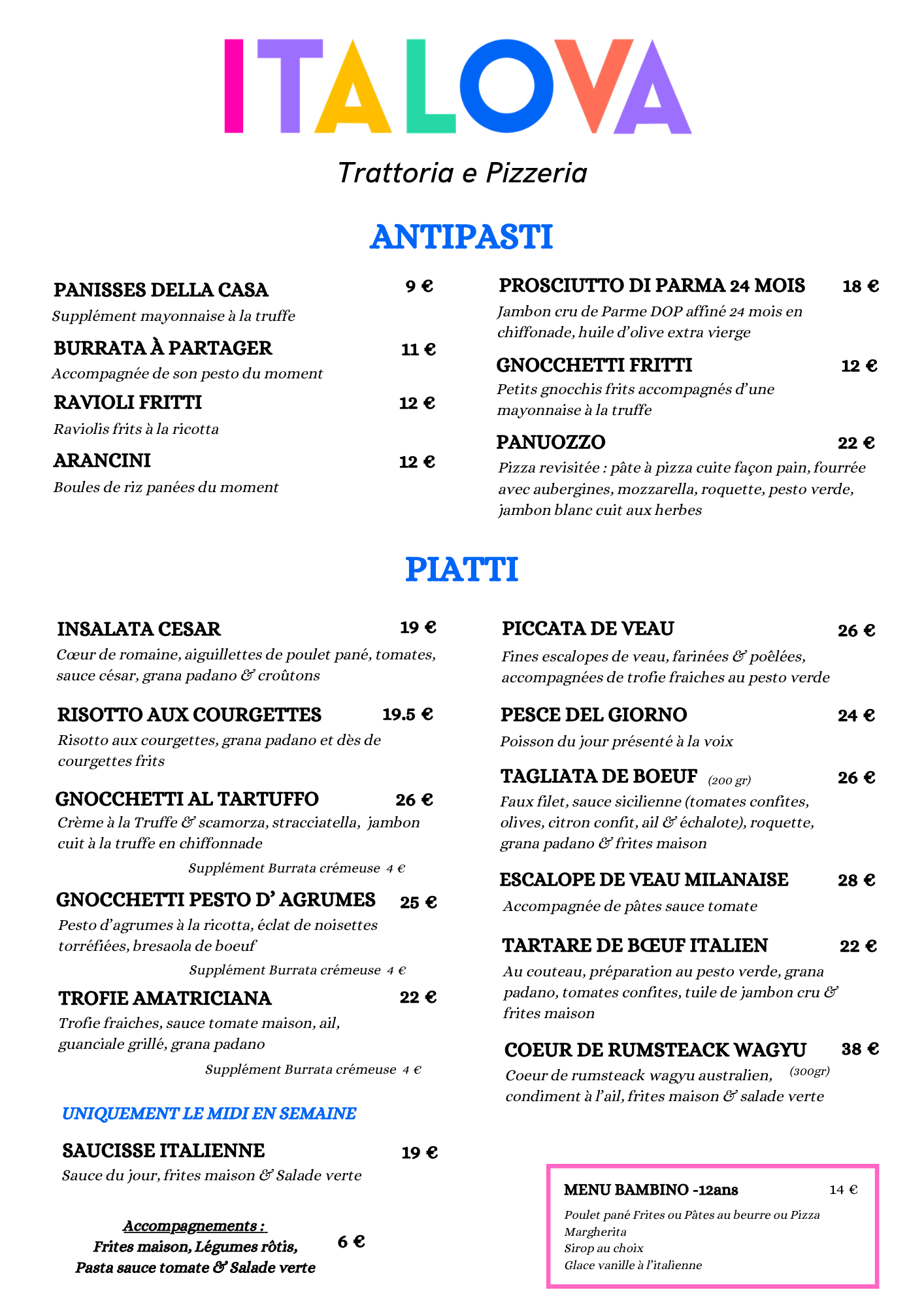 Chez ITALOVA, nous vous proposons des plats de saison préparés à partir de produits frais. Nous avons à cœur de travailler avec des fournisseurs et des producteurs locaux pour garantir la qualité de nos plats. C’est pourquoi, nous élaborons un menu à l’ardoise qui évolue chaque semaine.