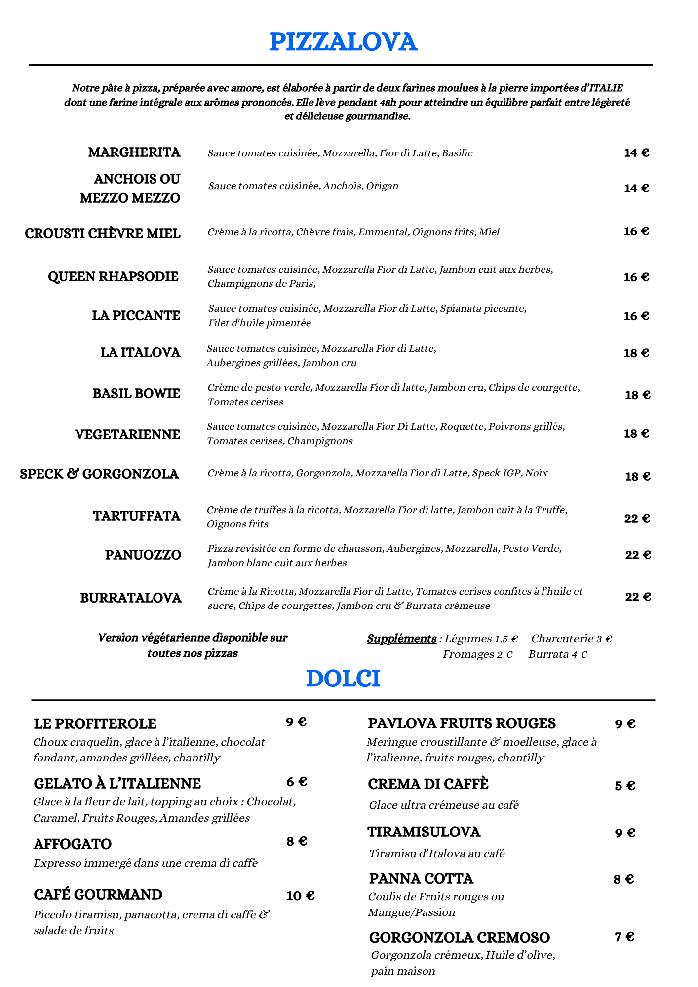 Nos pizzalova sont travaillées artisanalement à partir d’un mélange de farine intégrale moulue à la pierre pour une pâte aux arômes prononcés et légère.